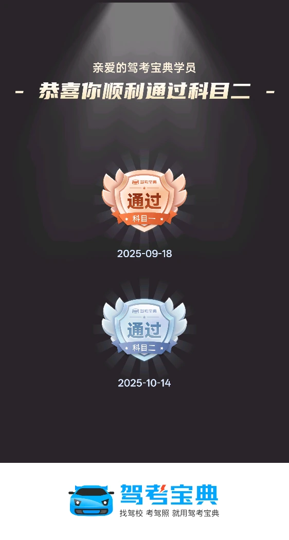 谢典,科二一次顺利通过!好运带给你们,宝子们,冲鸭!!