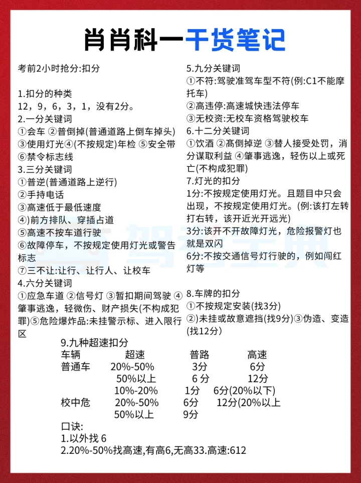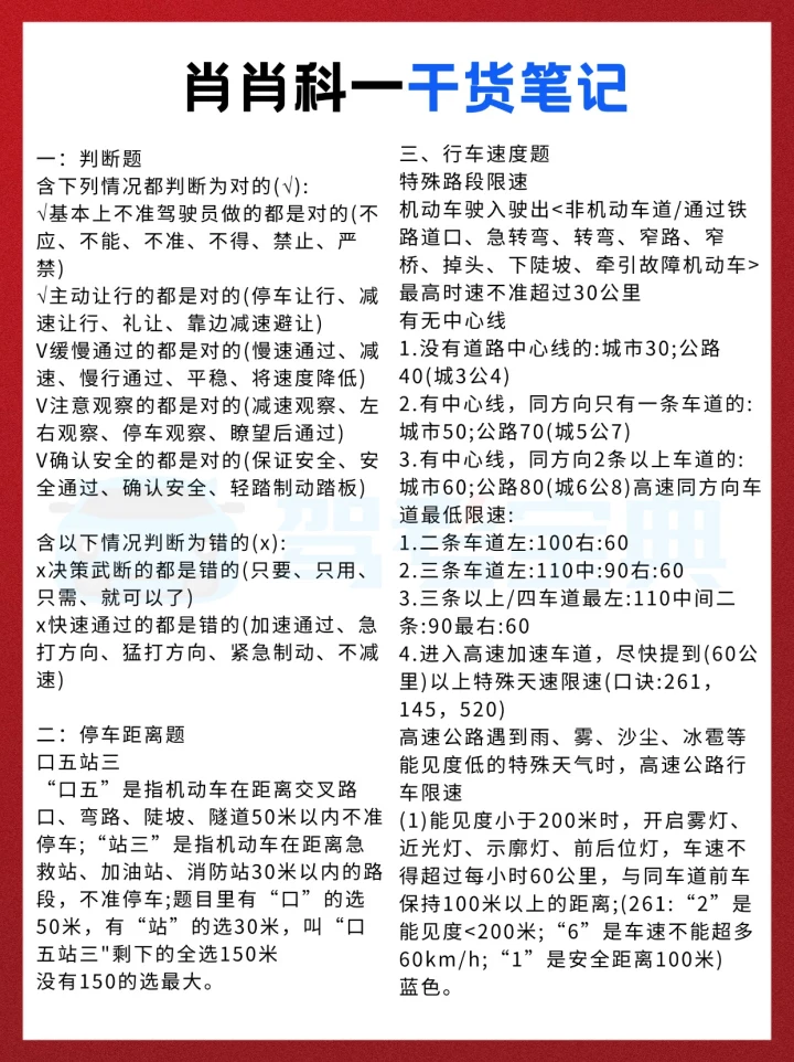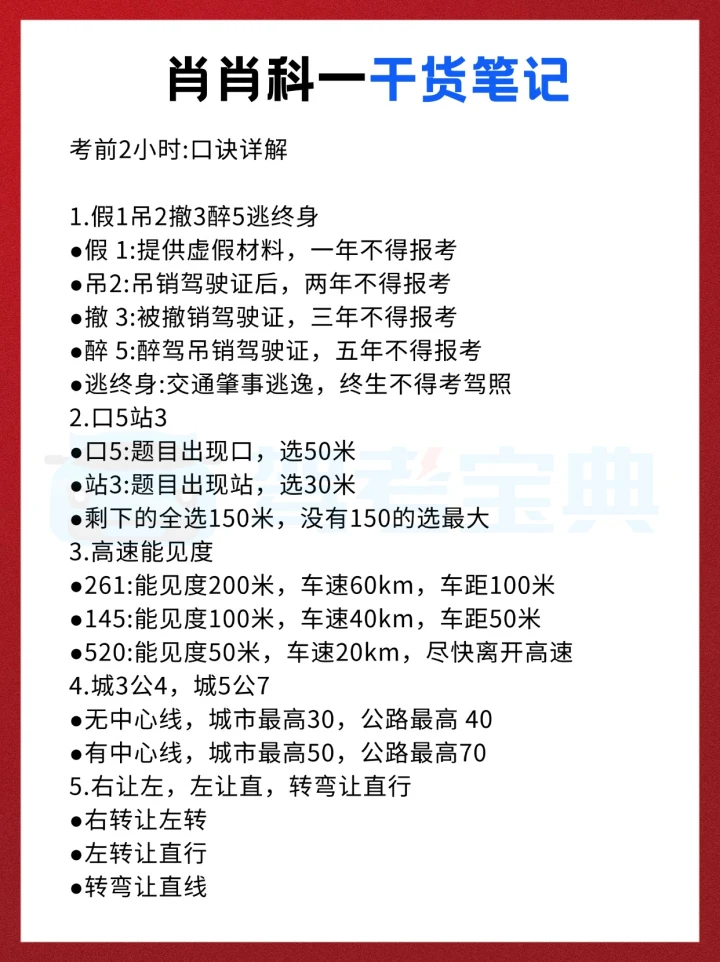 科目一真的没有大家想的那么可怕😊 别一看到题目多、有些绕,就觉得自己不行。其实关键就是多刷错题,把总错的知识点反复练,练到熟就行了。 题目很多都是有规律的,不用死记硬背,试着理解出题的逻辑。有些题确实句子很长,还加几个“以外”“不得”之类的词,容易把人绕晕,但多做几遍就有感觉了。 如果有些知识点实在记不住,可以分类整理一下再背。我之前看肖肖的科目一三小时精华课,里面都归纳得很清楚,用起来很方便。驾考宝典里也有专项练习模块,每个部分都有对应的知识点讲解,先理解再做题,效率会高很多~考试的时候真的会遇到不少原题哦! 把那些答题口诀多套进题目里练,用多了自然就记住了,印象会深很多✅ 考前一定记得把题库多刷几遍,保持手感~ 希望大家科目一都能一次过,加油冲冲冲!💪