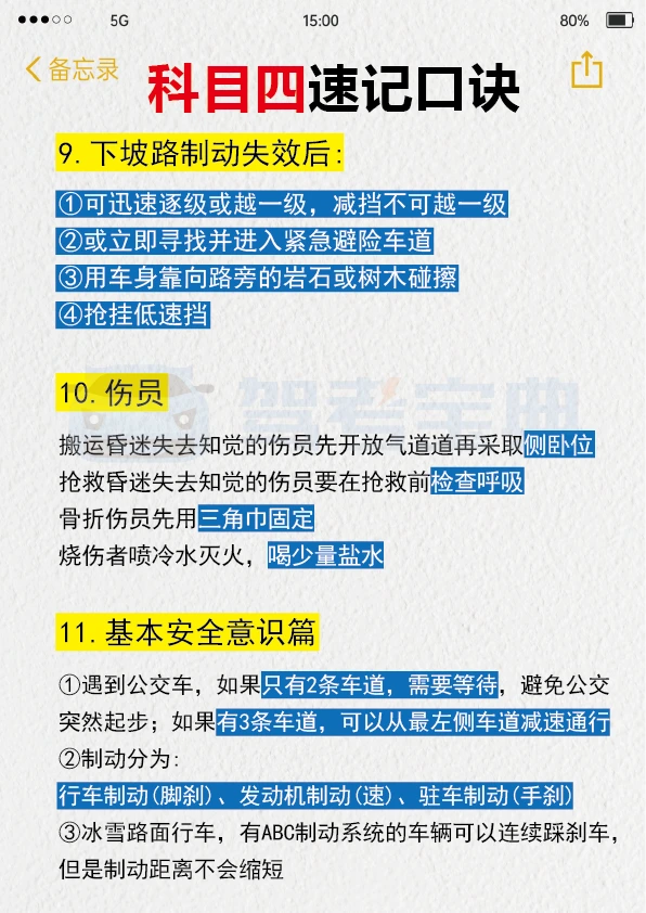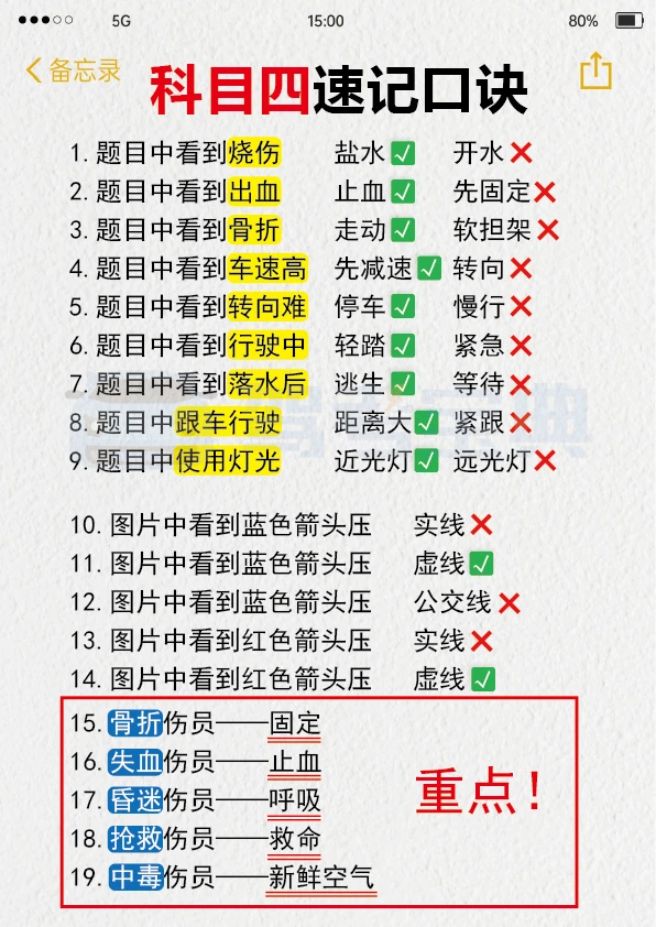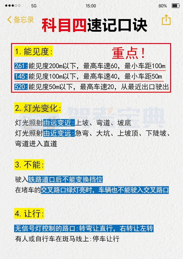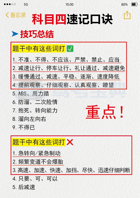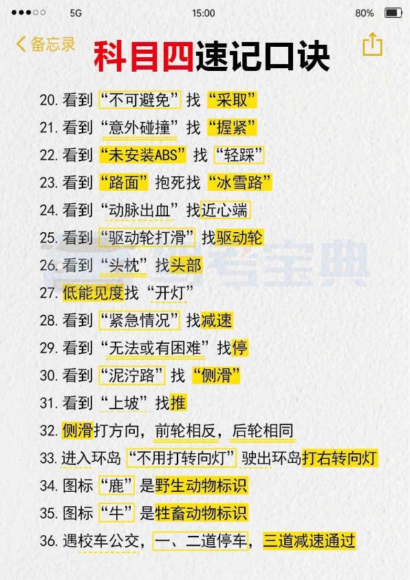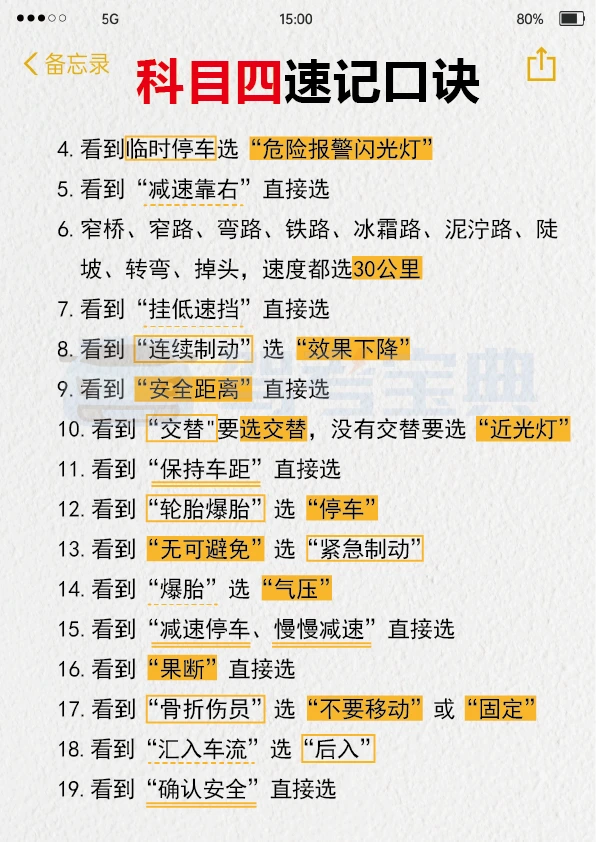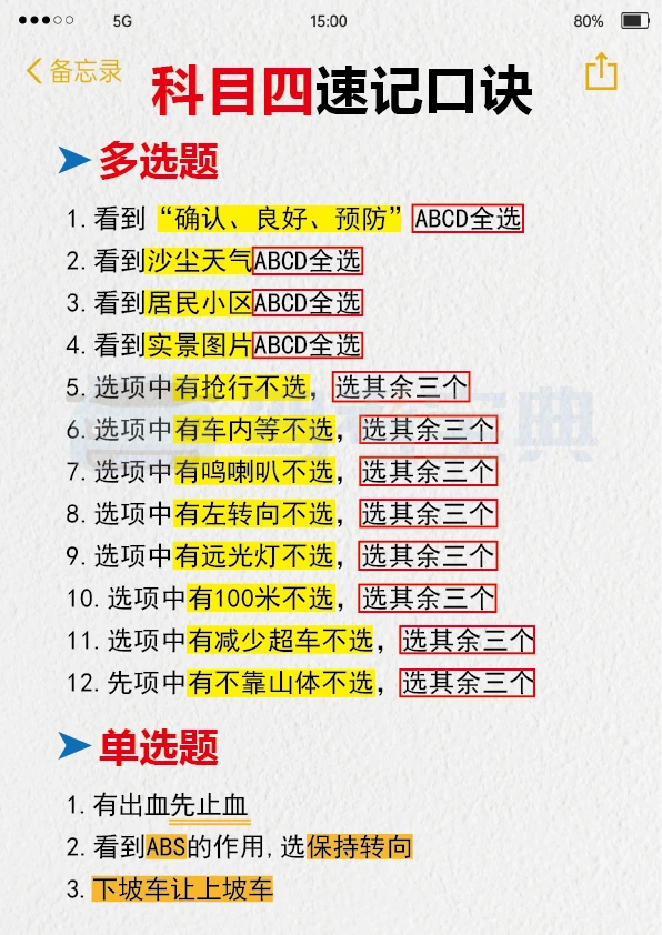 我找到了过科目四超棒的方法!! 我真的不喜欢题量大的题目,每次看到一大堆字就头疼,读题还没多久就没耐心了。但是,肖肖的科目四1小时课程真的帮了大忙。视频里讲得很清楚,各种题型和重点知识点都解释得明明白白。 这种视频课再加上快速记忆知识点和刷题软件,通过科目四应该没问题。特别是在考试前,多做几套题,再听一遍这个课,能更好地记住考试内容。 下面给大家分享一些驾考科目四的知识点,希望能帮到大家。 多选题: 1. 看到“确认、良好、预防”这几个词,ABCD全选。 2. 沙尘天气相关的题目,ABCD全选。 3. 居民小区相关的题目,ABCD全选。 4. 实景图片相关的题目,ABCD全选。 5. 选项中有“抢行”的,不选这个选项,选其余三个。 6. 选项中有“车内等”的,不选这个选项,选其余三个。 7. 选项中有“鸣喇叭”的,不选这个选项,选其余三个。 8. 选项中有“左转向”的,不选这个选项,选其余三个。 9. 选项中有“远光灯”的,不选这个选项,选其余三个。 10. 选项中有“100米”的,不选这个选项,选其余三个。 11. 选项中有“减少超车”的,不选这个选项,选其余三个。 12. 选项中有“不靠山体”的,不选这个选项,选其余三个。 希望大家都能顺利通过科目四,拿到驾照!