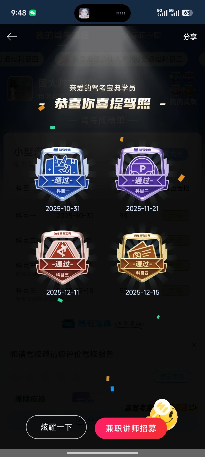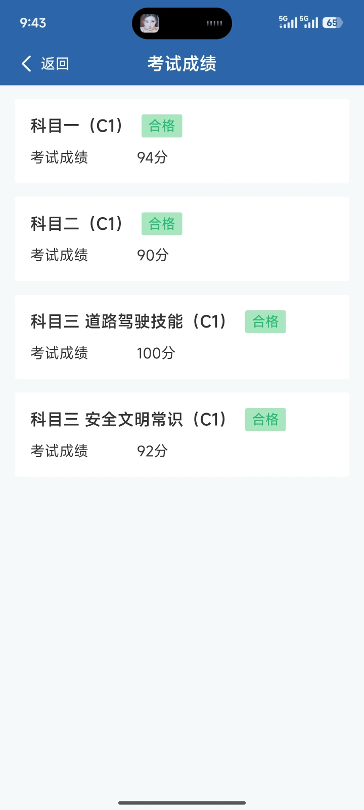 全部科目一把过,总共用时45天。要胆大心细,心态最重要👍