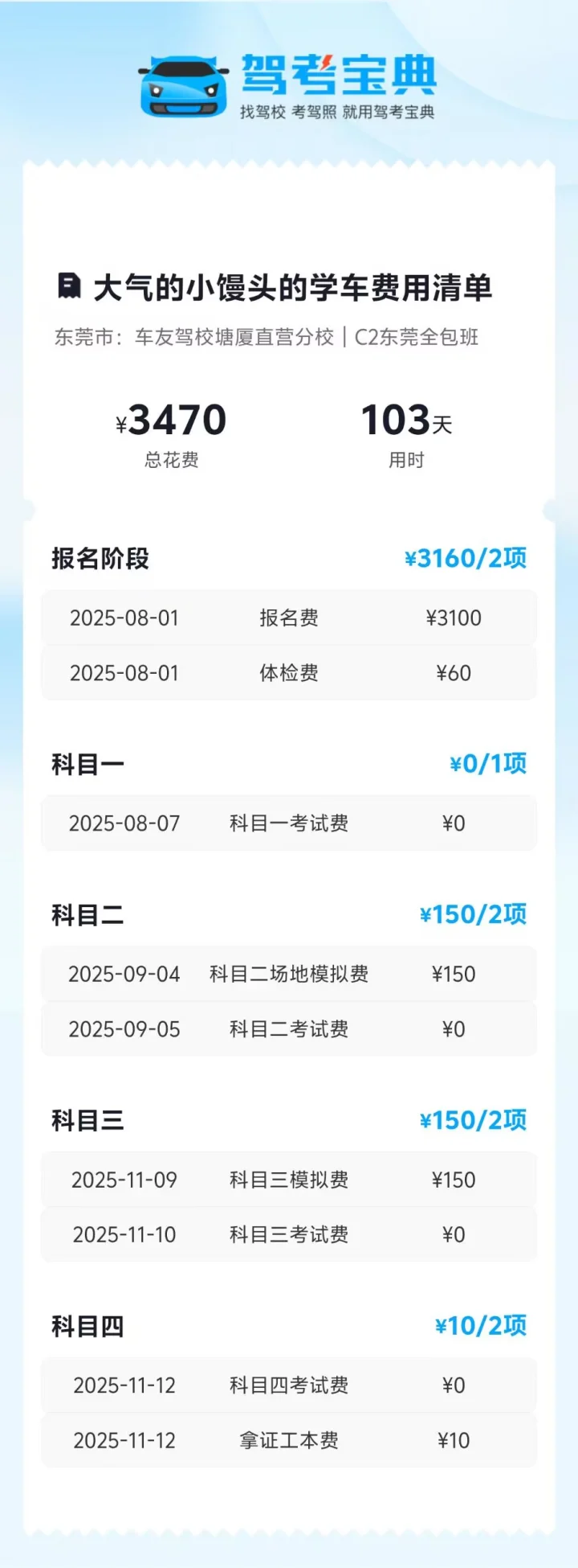也是让我学上便宜驾照了,报名就有优惠,报名费里面包含了4科的考试费,刚好我又是一把过,所以就很便宜 一切都是如此的顺利,顺利的我都不敢相信,科二科三教练让模拟我就模拟了一把,拿本真的很开心,特别是看到好多人说在广东考驾照低于5千都是骗子就更觉得自己走了狗屎运