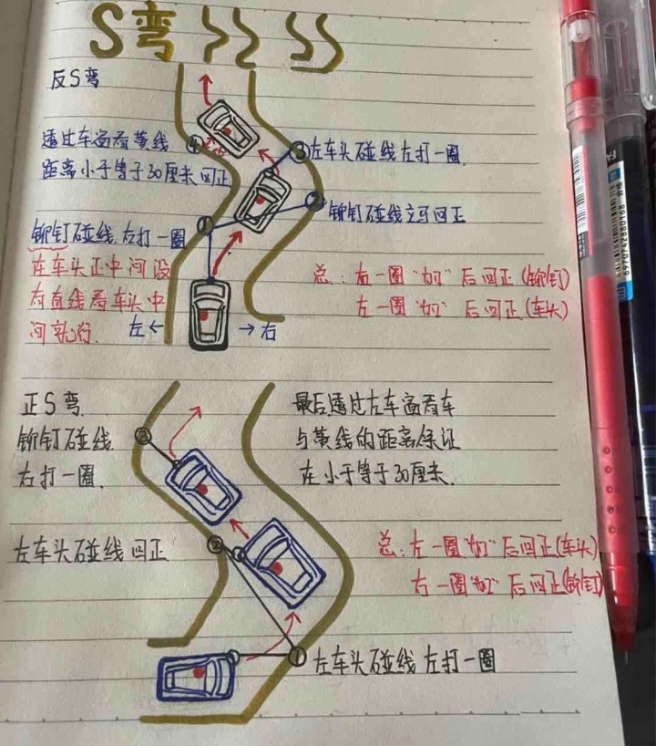 左大灯贴右线就向左打一圈,贴左线时回正;雨刷器高点贴左线则向右打一圈,出弯迅速回正。