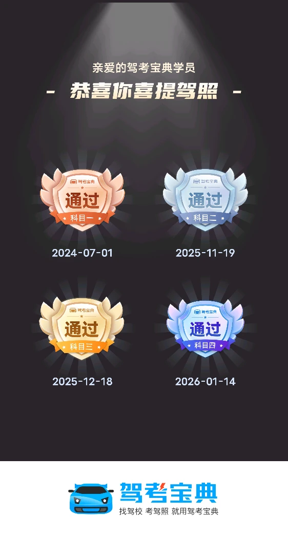 轻轻松松简简单单,感谢驾考宝典,今日前来谢宝典,祝愿大家考试都是一把过,今天是个好日子也是我最难忘的一天因为我今天科四考试合格顺利拿证了在此期间我感谢鑫航驾校刘校长和李冬明教练,要是没有刘校长和李冬明教练的严厉培训指导和训示就没有我的今天的成就,要想练车来鑫航驾校,本校一对一培训指导本校考试,本校练车在2026念接将要来临之际祝福鑫航驾校全体员工身体健康马到成功,马上有钱,也祝福鑫航驾校前程似锦一帆风顺更上一层楼,也祝福刘校长,李冬明教练身体健康,身体倍棒,吃嘛嘛香,也祝福你们在新的一年里笑口常开,八方来财,一帆风顺,一切如意,