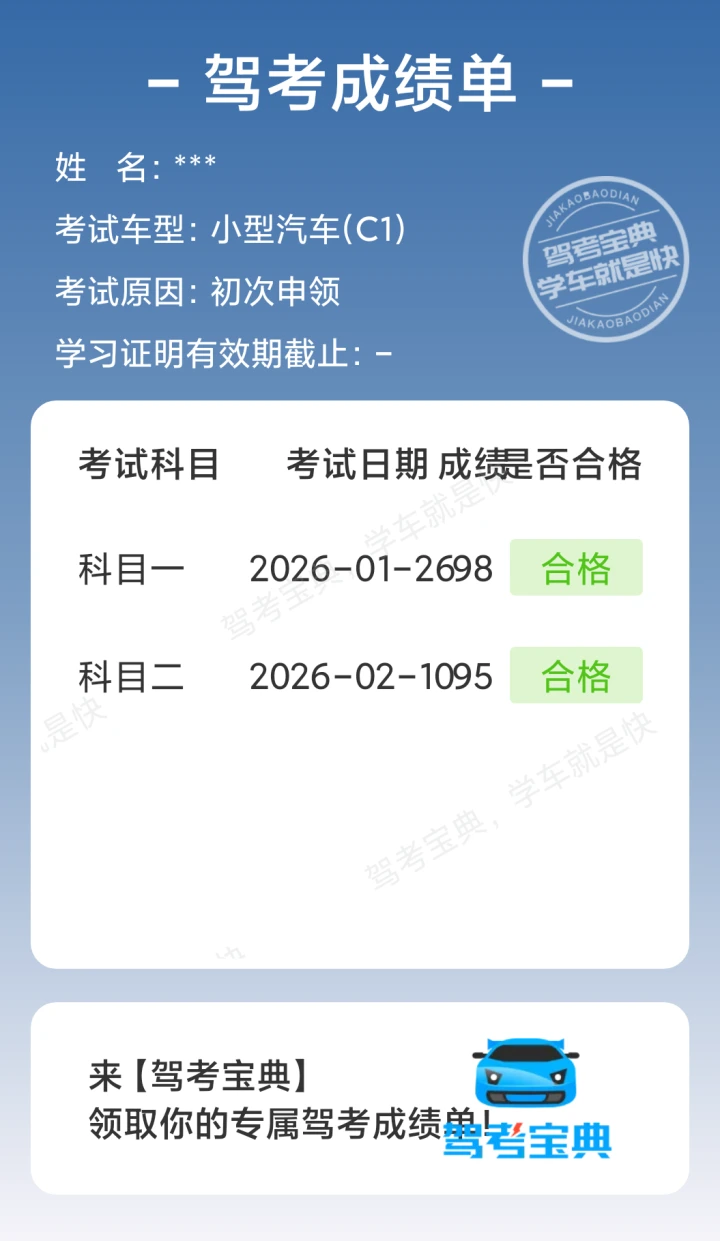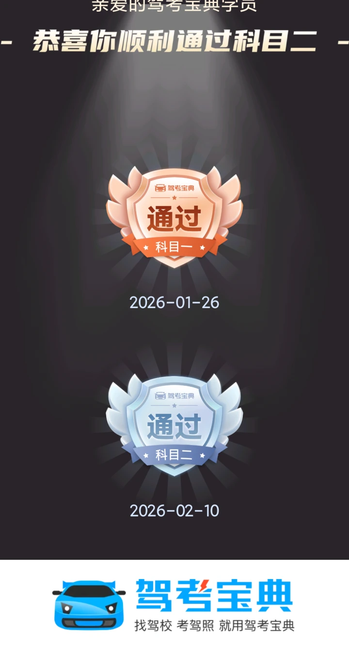 科目二顺利通过,开心到起飞。科目二就中途停车扣了5分。其他的全过。