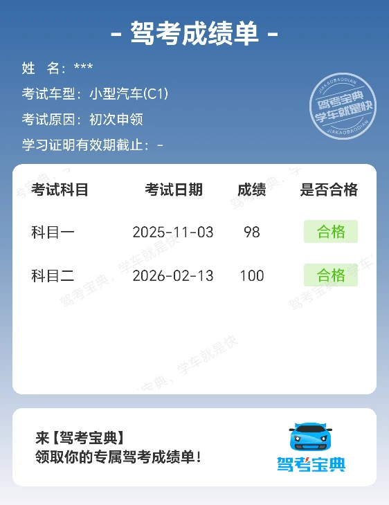 当前位置:首页>驾考圈>科目二>科目二挑战成功,继续加油!