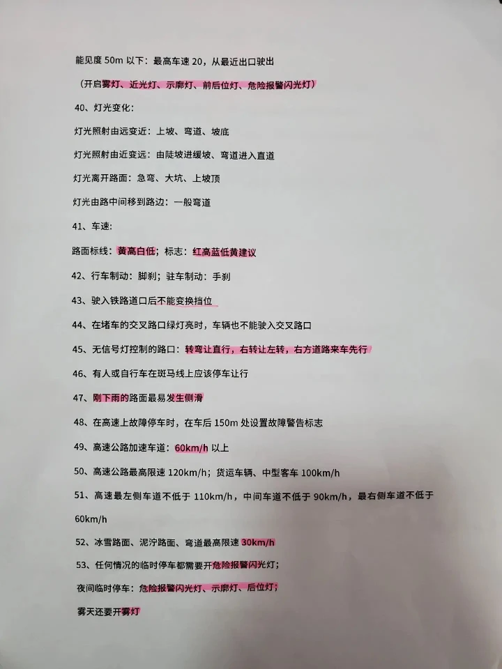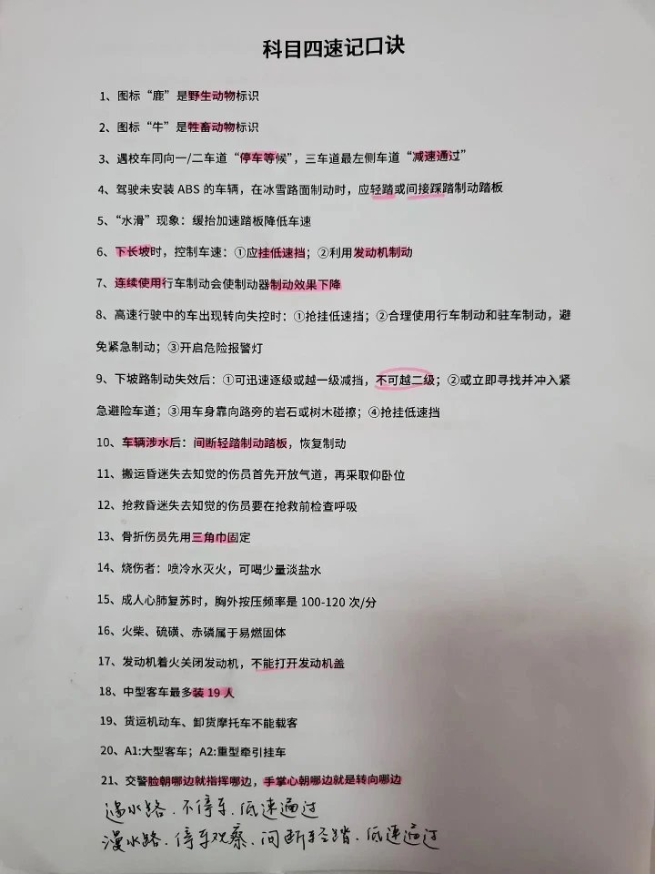 看到有人问“科四用几天”,我正好分享一下自己的经历——认真准备的话,两三天集中突破真的可以。 🍁 第一天:我先看了些科四的视频,了解大概考什么、题型是怎样的,心里有个底。 🍁 第二天(关键日):买了3小时精华课,认真看完就开始刷驾考宝典的题目。之后做模拟卷,一开始只有80分左右,我就把错题全部重做一遍,再模拟就能上90了。接着又刷了宝典里的“易错题”和“新题”,晚上用背题模式快速过了一遍错题本。 🍁 第三天(考试日):约的8点考试,8点半才进场。坐下后先平复心情,慢慢审题,最后98分通过,当场拿本。 📒 我也整理了几个常考口诀,做题时很实用 1️⃣ 右让左,左让直,转弯让直行 2️⃣ 辅让主,下让上,靠山让临崖,有障碍让无障碍,特殊车辆要让行 3️⃣ 先救命,后治伤(抢救伤员的原则) 4️⃣ 先止血,再固定(骨折伤员处理顺序) 5️⃣ 左转大弯,右转小弯 6️⃣ 一停、二看、三通过(铁路道口诀) 这些口诀覆盖了很多易错题,考前多看两遍很有帮助。科四并不难,集中精力刷题+记规律,你也很快能拿证!