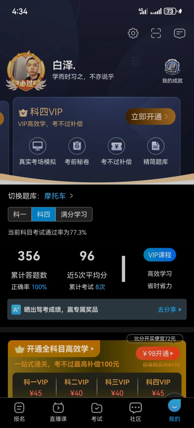 过来谢(卸)典 分享一下我的摩托车考试心得吧其实我就学了一天时间第三天就去考了😂😂😂 科一科四我都没刷几遍,你模拟能考九十分以上就可以,我第一次模拟考才四十分,第二次七十分,第三次就九十分往上了。 科一科四努力刷一刷就行 科二科三我去驾校练了俩小时,第二天去考场练了两把,约的就是第三天考试,感觉重中之重的就是一定要去考场练一练,不要不舍得拿考场费 科一早上迷糊错了三道,不然我觉得应该全部满分过了😂😂😂 祝各位刷题顺利,考试一把过😄